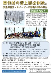 | 内容 | 間伐材の雪上搬出体験とスノービーチ(雪国のブナ)材活用の紹介を行います。 |